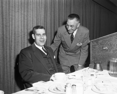 Arthur Crownover Junior, left of Nashville, Tennessee, head of Civitan International, bends down to talk with John H. Repper, president of the Fort Worth Civitan Club, at the club's luncheon.