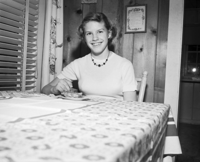 Thirteen-year-old Joan Peterson will be able to eat any food on her mother's table Thanksgiving day, November 27. And she's thankful about it. Joan has been on a restricted diet, mostly liquids, since having a 2 1/2-inch corsage pin removed from her stomach by surgery. She swallowed the pin August 22 while rolling up her hair and holding the pin in her mouth.