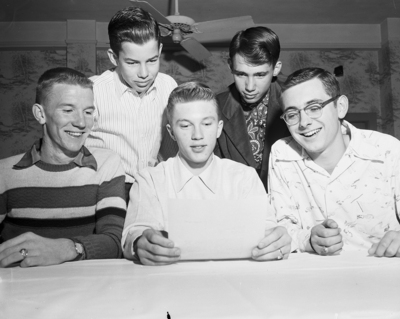 Hi-Y delegates to the sixth annual Model Legislature in Austin December 18-21 concur on a bill to present to a local club. Left to right are, seated, Don Dodson, Dick Garrett, Robert Hodshire, and, standing, Don Lemons and John Hornbuckle.