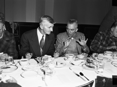 Two men converse at the annual Thanksgiving Dinner for News Vendors given at the Elks Club.