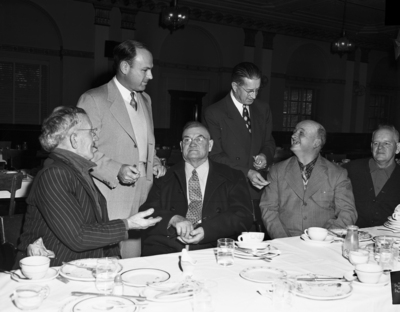 Amon Carter Junior, left, and Homer Belew, right standing; seated left to right, David J. Gorman, J. R. Varner and Monroe Odom.