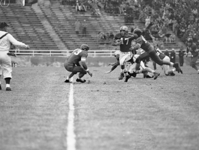 L. G. Dupre, Baylor sophomore, fights off one Rice tackler and prepares to step around Carl Johnson (43) on his way to a 30 yard touchdown in the second period of the game at Waco. Published in Fort Worth Star-Telegram evening edition November 30, 1952.