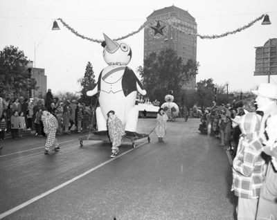 The 13-foot balloon Penguin in the foreground and the 14-foot Snowman in the background were just part of the first section of the Big Christmas parade Friday morning in downtown Fort Worth.