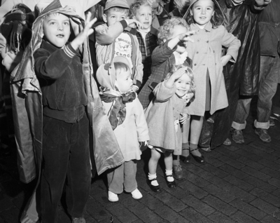 Debbie Slaughter, 3, right, daughter of Mr. and Mrs. W. H. Slaughter of Eagle Mountain Lake, waved to Santa Claus while Shari Vinsant, 2, daughter of Mr. and Mrs. Paul A. Vinsant, watched part of the Christmas parade ahead of Santa Friday morning.