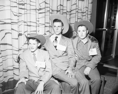 These boys are three of 32 Texas 4-H Club members who are delegates to the National 4-H Club Congress in Chicago. Left to right, Elowyn Ellis of Plainview, Kenneth Sellers of Ralls, Crosby County, and Delbert Davidson of Big Spring. The boys are well dressed in suit and hat for their travel.