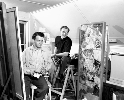 Series on Fort Worth Bachelors. Good Companions. Reilly Nail (left) and Marshall Young Junior. Nail, artist, is shown seated in front of a large canvas with his long time friend, Young Junior, sitting close behind him, holding a canvas. The two are looking to their lefts, appearing to be looking at something off camera. Both are smiling. The roof of the small studio is slanted and the space is covered with various drawings and art supplies. There is also a tall board covered in "New Yorker" magazine covers.