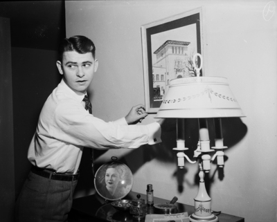 Series on Fort Worth Bachelors. Petroleum Engineer. E. E. Merkt Junior. Merkt Junior is shown adjusting a hanging, framed picture on the wall, as he looks back. In front of him is a table with a lamp, a circular photo of a woman and other small decoration pieces. He is wearing a pair of trousers and a shirt and tie. Merkt Junior is a graduate of the University of Texas and a former resident of Wichita Falls, Texas.