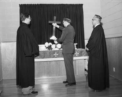 Robert Farley, an officer of the Christ Lutheran Church congregation, places the cross on the altar of the new church building during dedication services Sunday. In charge of the services were Reverend Paul Schroeder, pastor, left, and Reverend A. O. Rast of Austin.