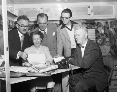 Making music for Christmas tree-lighting ceremonies Tuesday night in Burk Burnett Memorial Park is their assignment. Left to right, standing, Karl Kritz, general director for Fort Worth Civic Opera Association; Kenneth Pitts, opera orchestra manager, and Floyd Lisle, civic opera baritone. Seated, Frances Kay, Shield Company staff organist for the "first night" program, and Paul Huffor, president, Local 72, American Federation of Musicians, and Fort Worth Professional Musicians Association.
