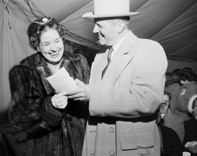 Mrs. Mary Lou Palmros, one of the singers who entertained at the opening of the Star-Telegram Christmas Tree and Music Festival, makes a last-minute program check with Parker Willson, master of ceremonies. Festival location was Burnett Park.