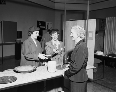 Mrs. Richard Morse, left, and Mrs. Mariana Thomas, center, were among early arrivals for the preview of Fort Worth Art Association's Christmas Gift Show in the Public Library gallery Tuesday night, December 2nd. They are shown here discussing ceramics and a mobile on exhibition, with Mrs. Rhinehart Rouer, one of the hostesses for the evening.