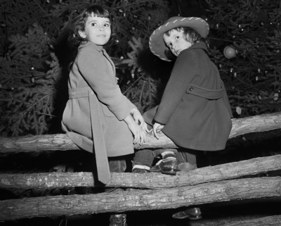 Judy Conner, 6, left, and Linda Conner, 5, daughters of Dr. and Mrs. Cooper M. Conner, perched on the fence by the Star-Telegram Christmas Tree as they listened to the musical program Sunday night at Burk Burnett Park.