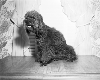 Pixie the poodle, owned by Mrs. Eugene Blocker of 1255 West Rosedale. Pixie and her owner spent the whole day at the pet "beauty shop" before leaving for New York to visit relatives. Pixie is shown in the center of the image before getting a haircut. Published in the evening edition, April 19, 1950.