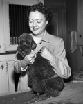 Pixie the poodle, owned by Mrs. Eugene Blocker of 1255 West Rosedale. Pixie and her owner spent the whole day at the pet "beauty shop" before leaving for New York to visit relatives. Pixie is shown in the front of the image, as her owner Mrs. Blocker, ties a new bow around her neck. The ribbon for the bow is one of several new accessories Mrs. Blocker bought Pixie for their trip. Published in the evening edition, April 19, 1950.
