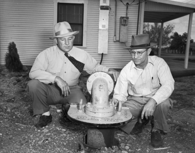 Councilman C. A. Godfrey is shown with Mayor J. M. Scott, kneeling next to the city of Burleson's new water well. The new pump extended several hundred feet underground. Published in the evening edition, April 11, 1950.