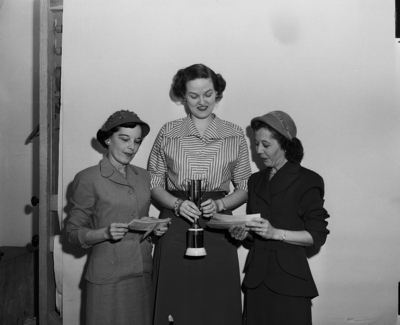 Epsilon Sigma Alpha. Mrs. W. L. Ballenger, left, city co-ordinator and general chairman of the Epsilon Sigma Alpha Goodfellow Ball, and Mrs. W. L. Nichols, right, president of the organization's city council, Thursday turned in $1600 for gifts for needy children. Miss Lucille Robinson, president of Theta Delta Chapter holds the trophy for the ticket sale winner.