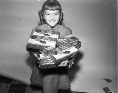 Deanna Olson sells Girl Scout cookies; she's 8 years old and a Brownie at Circle Park Elementary School, Fort Worth, Texas.