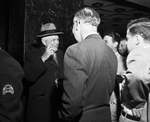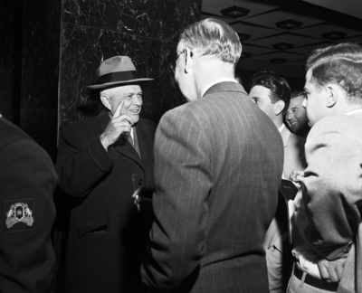 Charles E. Wilson talks with reporters in a lobby of Baker Hotel in Dallas.
