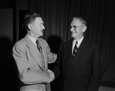 Mid Continent Oil and Gas Association. Chosen chairman and vice chairman of the state and local taxation committee were H. G. Chase of Chicago, right, Pure Oil Company, and Frank Lawshe of San Antonio.