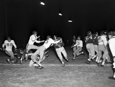 Fullback Wayne Boles of Terrell drives two yards into end zone as Stephenville's Sam Taylor (63) and Jim Kelley (65) hurdle blocker in defensive attempt. Terrell won, 28-6. Published in Fort Worth Star-Telegram evening edition December 13, 1952.