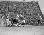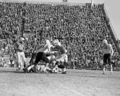 The type of defensive play Baytown may expect from Lubbock in the state 4A grid final is demonstrated by this picture. The Westerners are swamping Enrie Manicchia of North Dallas for no gain on an attempted slash at end in the semifinals at Lubbock. Lubbock won this one, 42-14. Published in Fort Worth Star-Telegram morning edition December 16, 1952.
