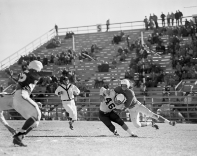 Feet flying, David Kingcaid of North Dallas takes a free ride as he makes a shoulder tackle on Jimmy Welch, Lubbock's all-state back, in the second period of the game at Lubbock. Lubbock won, 42-14. Published in Fort Worth Star-Telegram morning edition December 14, 1952.
