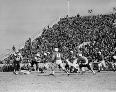 Max (Red) Nolan, Lubbock back, fights his way to a 10-yard gain against North Dallas in the game at Lubbock. Hanging on for a one-leg tackle is Jack Chewning, Bulldog guard. Coming up is Jerry Polen (70), an end. The Westerners won, 42-14, to enter 4A finals for second straight year. Published in Fort Worth Star-Telegram morning edition December 14, 1952.