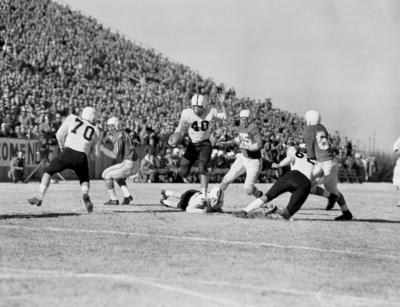 Jimmy Haynie of Lubbock steps over a prostate teammate on his way to an 18-yard touchdown run in the first quarter against North Dallas at Lubbock. At right is James Middleton, tackle, making a block. In background is Ray McClung, North Dallas guard. This is the first score for the powerful Westerners in their 42-14 semifinals victory. Published in Fort Worth Star-Telegram morning edition December 14, 1952.