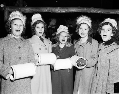 Crowley school youngsters sang carols and Christmas songs Saturday night before the Star-Telegram Christmas tree at Burk Burnett Memorial Park. Left to right are Ann Hoffman, Judy Stevens, Peggy Jean Rhine, Patricia Ann Timmons and Sandra Lee Daggett.