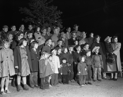 Surrounded by children and others at the Christmas tree are, left to right, Ray Whittington, George A. Hoeldtke, Lum Lovette, H. I. Trout, J. E. Casstevens, Robert D. Patterson, Fred L. Raborn Jr., A. L. Austin, and Bill Killian.