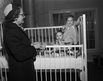 Mrs. D. T. Costello made friends with Linda, center, and Glenda West, year-old twin sisters of St. Teresa's Home, at open house Sunday afternoon. The enlarged and newly decorated children's home was inspected by 400 guests.