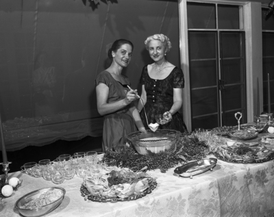 Mrs. Lee Bassinger, left, and Mrs. C. A. Caldwell, presided at the serving table and served as chairmen at a christmas cocktail party Sunday given by Glen Garden Women's Gold Association for their husbands at Glen Garden Country Club.