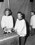 It was cold waiting Monday night for singers on the Star-Telegram Christmas Tree and Music Festival program. At left, Martha Benfer, 11, daughter of Mr. and Mrs. R. C. Benfer, and Jerry Don Mitchell, 11, son of Mr. and Mrs. J. M. Mitchell huddle over a stove before joining White Settlement School singers.