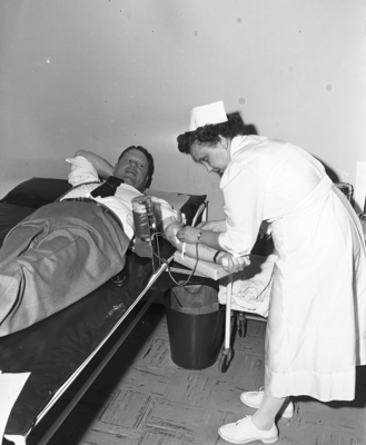 Congressman Wingate Lucas of Grapevine is shown at the North Texas National Defense Blood Center, where he donated a pint of blood for the armed forces. Helping him make his contribution is Miss Lilith Haney, nurse.