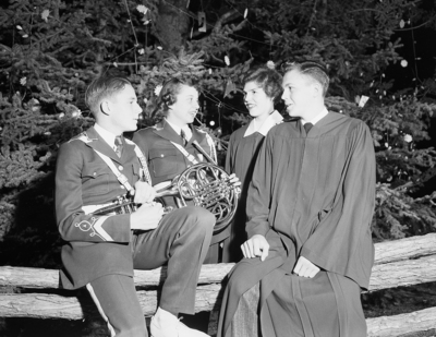 Participants in the Star-Telegram Christmas Tree program Tuesday night were these members of the Arlington High School group - left to right, Henry Armstrong and Judy Fillmore, band members, and Anne Rossberg and Fred Dalton, members of the Colt Choraliers.