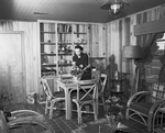 Mrs. W. J. Weaver arranging display of flowers in den of her new home, 6409 Waverly Way Rd. She has wicker furniture and built-in book shelves.