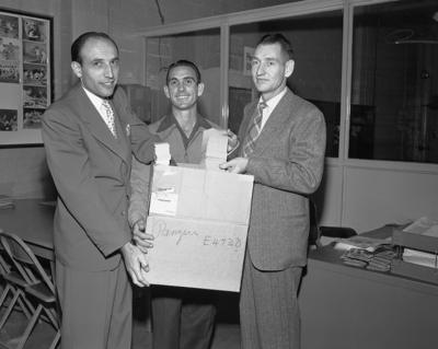 H. G. Starkey, Jack Brittain, and Hugh Pennington, left to right, display the 32,000 Golden Gloves tickets which will be distributed to Consolidated employees for eight of the nine nights of the regional and state Golden Gloves tournaments by the Convair Recreation Association.