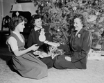 Phyllis Brake, left, and Virginia Robinson, center, of Lena Pope Home, got an early start on Christmas at the 20th annual Delta Rho Delta Sorority party for teenagers of the home.