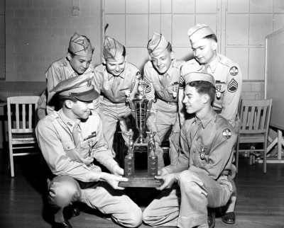 Admiring the Star-Telegram trophy for marksmanship, they won for the second straight year are left to right, back row, Charles Tuggle, Frank Perkins, Jimmy Vickery and Jack Anderson; front row, left to right, Edwin Russell and Johnny Dunton.