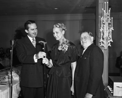 Dr. May Owen, recipient of the gold-headed cane award of the Tarrant County Medical Society, is shown with Governor Shivers, left, and Dr. Porter Brown at River Crest Country Club, where the presentation was made by the governor.