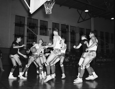 Paschal's Harry Scaling (with ball) looks for basket as Cleburne's Frank Hyde (33) tries encircling movement Wednesday night. Paschal won, 69-27.