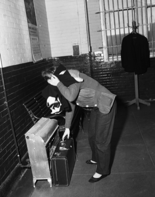Mrs. Thelma Juanita Bishop, 22, was camera shy at county jail after she was returned from Tempe, Arizona, to be questioned about the North Fort Worth State Bank robbery and several liquor store holdups.