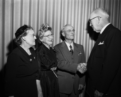 Lee Johnson Jr., right, president of the First National Bank, congratulates Carl Stolper on his coming retirement while Mrs. Jane James, left, and Miss Bertha McCleskey, both of whom will also retire January 1, await their turn during the bank's Christmas party. The three employees were honored by bank officers and fellow employes.
