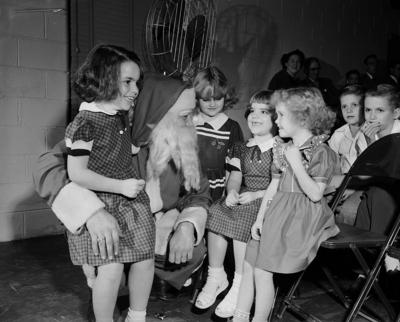 Tarrant County Children's home. Jane Stewart, Patricia Armstrong, Wanda Faye Stewart, and Mary Murphy are talking to Santa Claus.