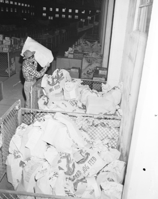 Busy volunteer workers at their good Christmas task of preparing the hundreds of Goodfellow bundles being made possible through your contributions to the Goodfellow Fund. John W. Wilson is shown with a pile of sacks ready to go.