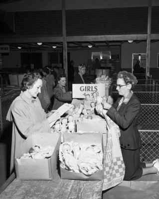 Busy volunteer workers at their good Christmas task of preparing the hundreds of Goodfellow bundles being made possible through your contributions to the Goodfellow Fund. All little girls should have a doll on Christmas and supervising this counter are Mrs. Frank Clayton and Mrs. William V. Plankey.