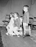 Three members of the Glen Rose School's first grade rhythm band listen to other entertainers while waiting to go on stage themselves. Left to right are Linda Bass, daughter of Mr. and Mrs. Sam Bass; Virginia Ann Pruitt, daughter of Mr. and Mrs. J. O. Pruitt Junior, and Gerold Wiggins, son of Vance Wiggins. The youngsters appeared on the Thursday night program at the Star-Telegram Christmas Tree and Music Festival in Burk Burnett Memorial Park.