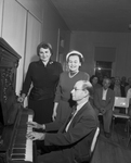 Mrs. Hubert Quillin and Mrs. R. C. Rudell standing by the piano and V. T. Collins playing the piano. The piano was presented to the Tarrant County Home for the Aged from the Eta Rho chapter of Epsilon Sigma Alpha Sorority.