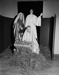 These students will join some 100 others Sunday night in presentation of an ancient English pageant, "The Festival of the Nine Legends of Christmas," in First Methodist Church. In the tableu, Barbara Cobb, stading in the rear, is the Archangel Gabriel; Carl Grasner Jr., left, is Joseph and Kay Kerbow, is the Virgin Mary