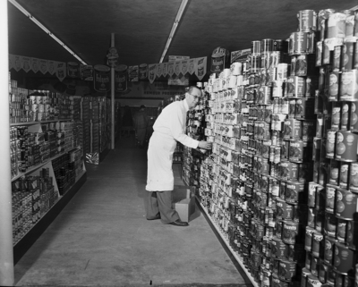 Series opening of new Buddie's Super Market Number 3, 6825 camp Bowie. Bill'O Brient, groceries manager, in the new Buddies Super Market Number 3. O'Brient is shown here completing a display of canned goods for the formal opening of the store at 6825 Camp Bowie Monday and Tuesday.